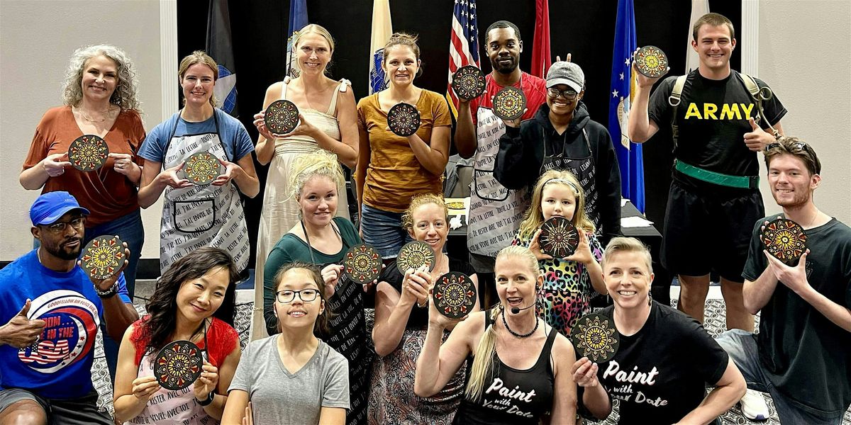All participants will walk away with their own finished 6" wood circle mandala dot creation including display stand.