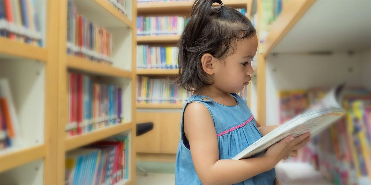 Image: Small family groups and young children in playful poses in front of a person seated in a large chair holding an open book. Chinese lanterns hang above text saying 普通话 – 英语 双语故事会 Mandarin-English Bilingual Storytime.