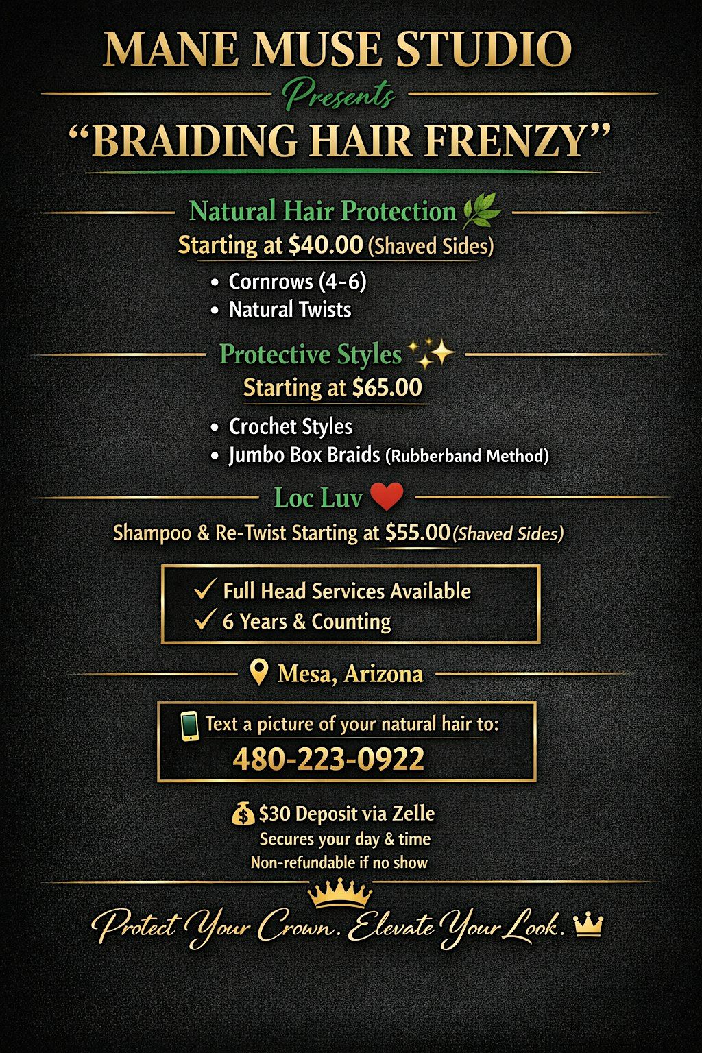 Ready to protect your crown and step into a new look? I’m now accepting new clients in Mesa, Arizona! 💚💛🖤