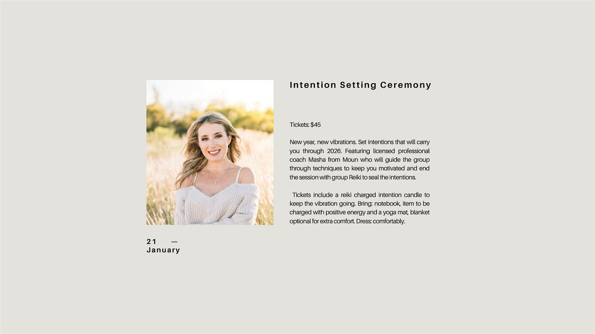 New year, new vibrations. Set intentions that will carry you through 2026. Featuring licensed professional coach Masha from Moun who will guide the group through techniques to keep you motivated and end the session with group Reiki to seal the intentions.