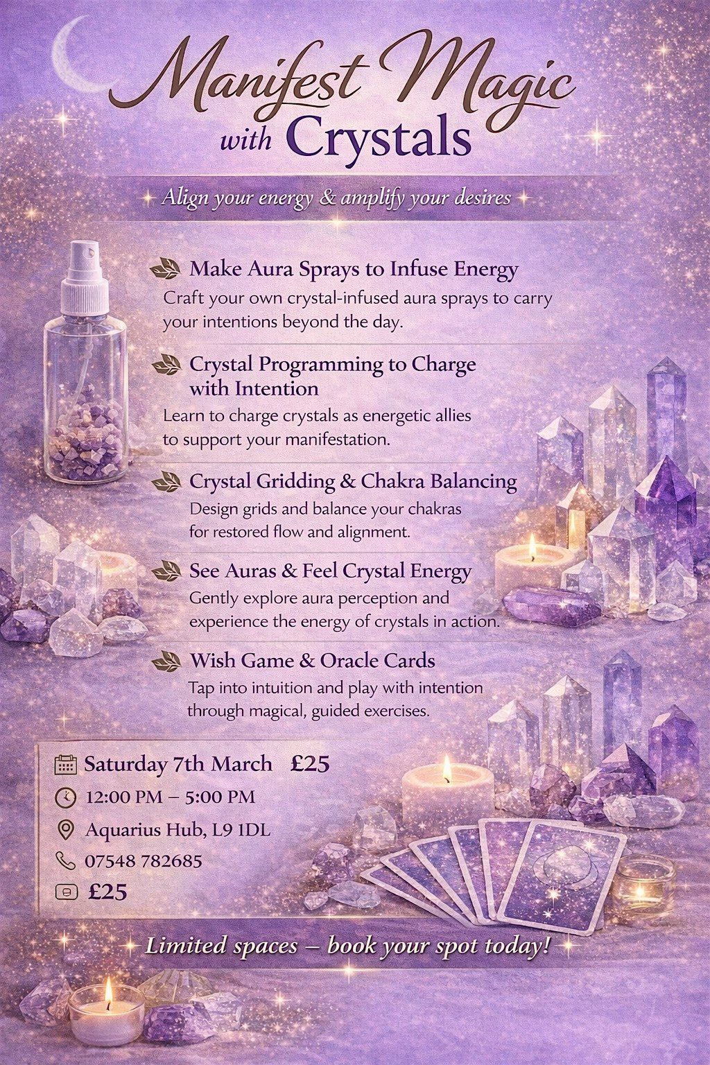 Info: We will be making Crystal Infused Aura Sprays with Intention.Programming Crystals to help.manifest.Crystal Gridding & Chakra Balancing. Explore seeing and feeling Auras. Oracle cards and seeking answers through Wish game to assist with manifesting your Intention with oppotunties to seek and find solutions with other like minded people.