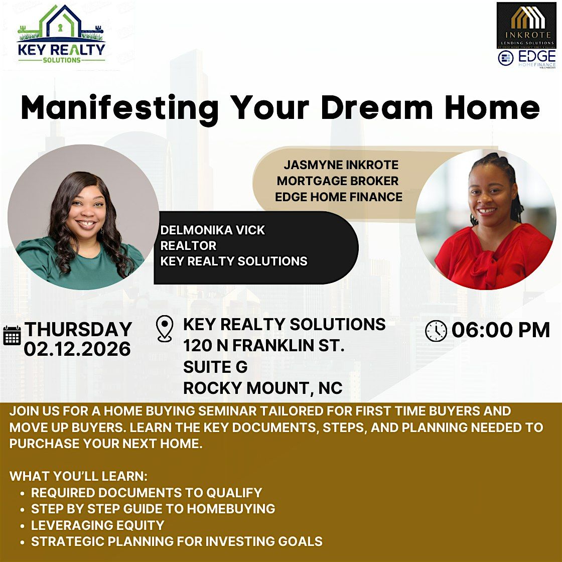 Join us for an empowering and informative home buying seminar designed to walk you through the steps, documents, and strategy needed to confidently purchase your next home in 2026 and beyond.