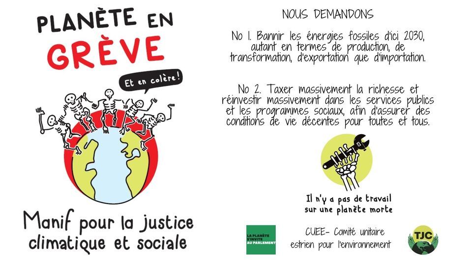 Partout au Québec, des associations étudiantes, des groupes syndicaux et des organismes communautaires se mobilisent afin de réclamer des actions rapides et directes pour l'atteinte de la justice climatique et sociale. La parole des expert.e.s est sans équivoque: les impacts de la crise climatique s'accélèrent et se multiplient. Il est urgent d'agir pour éviter le pire, pour le bien des générations actuelles et futures. À l'aube des élections provinciales du 3 octobre, venez manifester avec nous et faire entendre votre voix. Demandons haut et fort aux décideur.euses de faire de la justice climatique et sociale une priorité et de faire preuve du courage politique nécessaire pour proposer des solutions à la hauteur des problématiques soulevées.