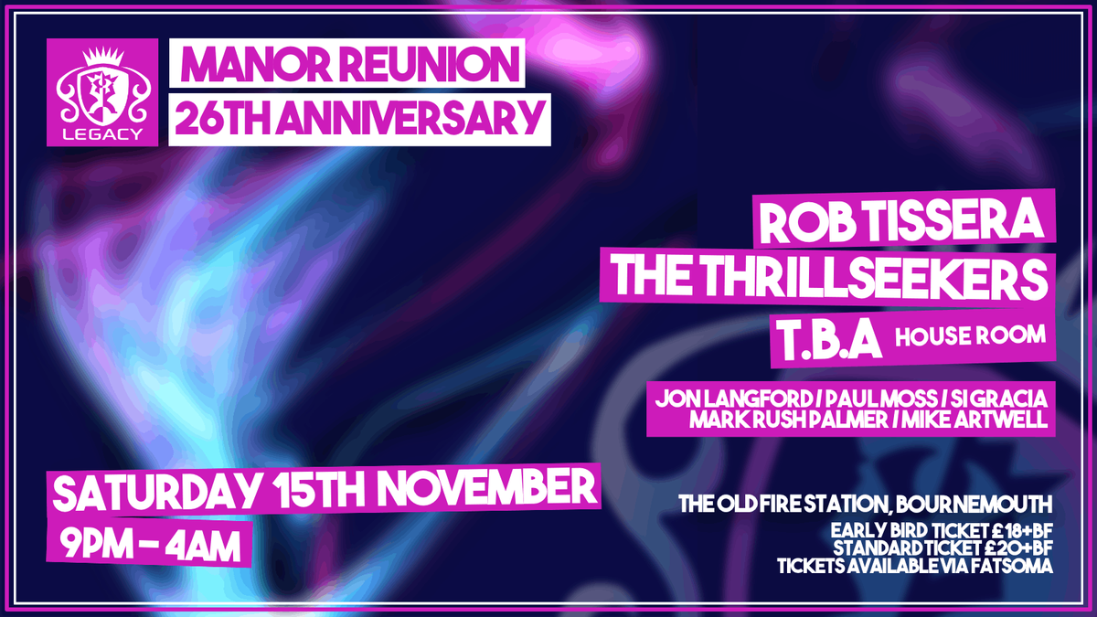 Manor Reunion 26th AnniversaryThe Old Fire Station, Holdenhurst Road, Bournemouth.Saturday 15th November9pm - 4am