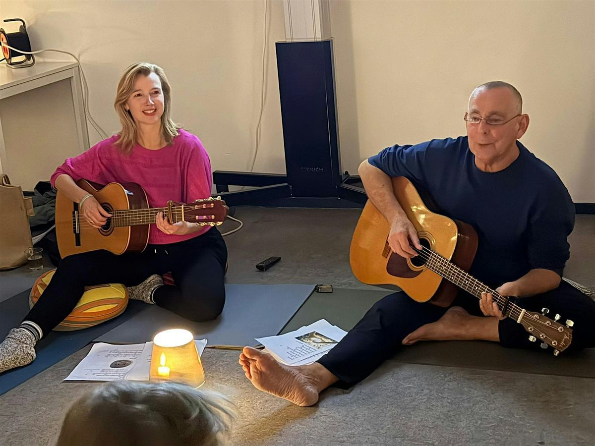Tijdens deze bijzondere bijeenkomst begeleiden Eddy Binnenkamp en Mathilde Boskma het mantra zingen met live gitaarmuziek.