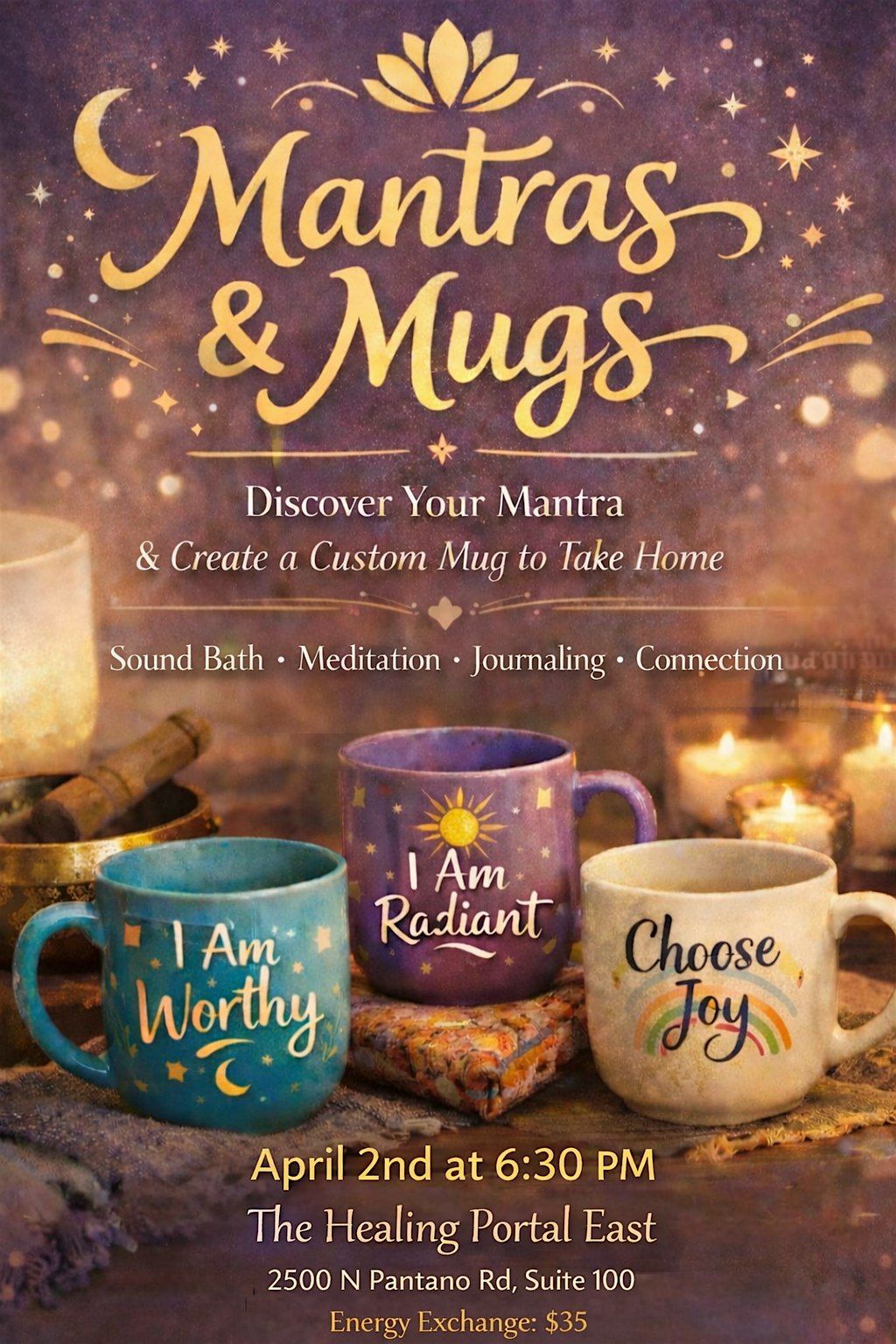 On April 2nd, we're gathering for Mantras & Mugs- an evening of sound bath, meditation, journaling and connection.