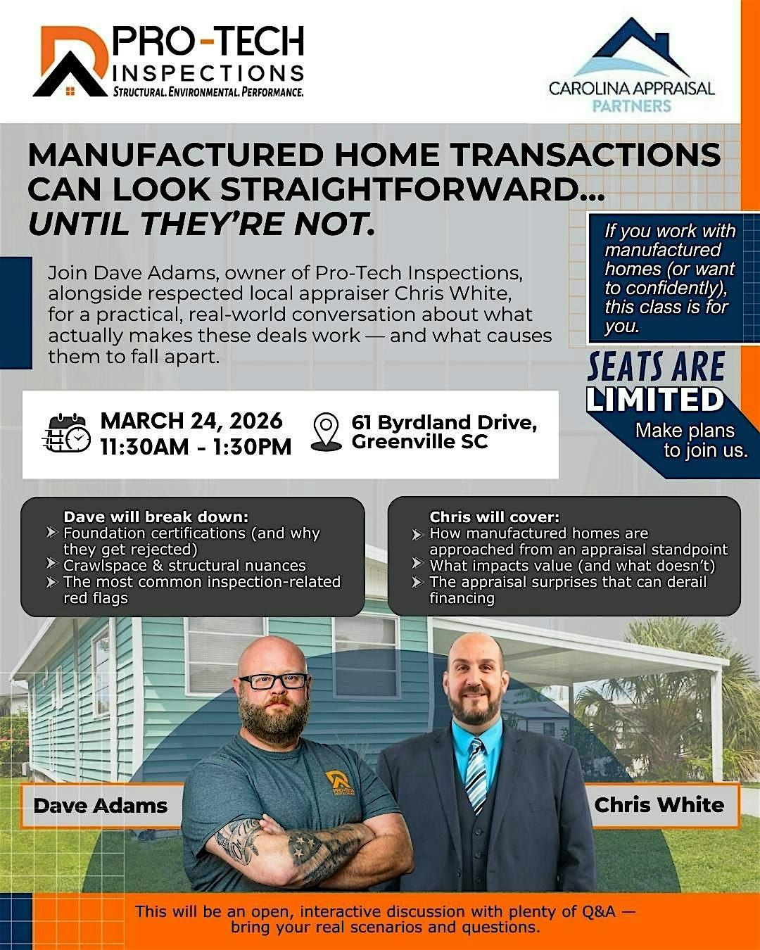 Join Dave Adams, owner of Pro-Tech Inspections, alongside respected local appraiser Chris White, for a practical, real-world conversation about what actually makes these deals work — and what causes them to fall apart.