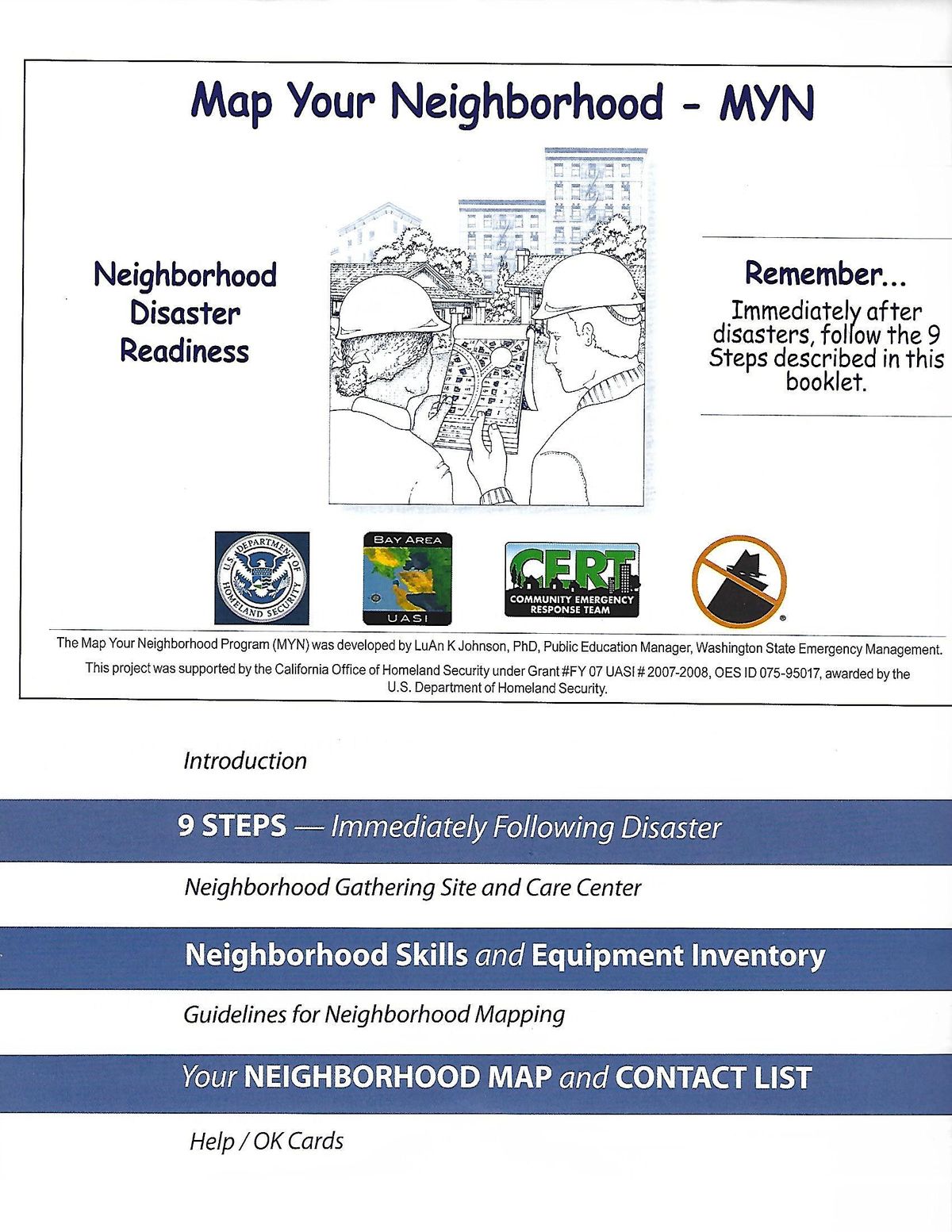 Remember that disasters can be caused by not only by earthquakes but also by common occurrences such as power outages, fire, and water main breaks. When neighbors know each other and the equipment and skills they can provide, together you can be more self-sufficient when the Fire Department and other First responders are delayed. Let it begin with you.
