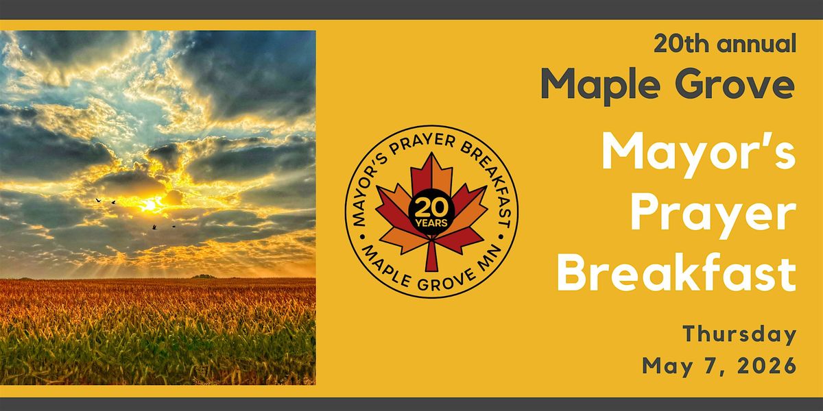 Maple Grove Mayor Mark Steffenson cordially invites you to the 20th annual Mayor's Prayer Breakfast. This community event takes place Thursday, May 7, from 7:15 to 9 a.m. at Rush Creek Golf Club. The event includes a keynote speaker, music, buffet breakfast, and an opportunity to visit with other attendees and share in the joy of living and working in our community.