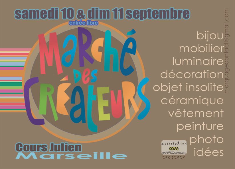 Notre prochain événement du « Grand Marché de Noël des Créateurs » se déroulera sur le Cours Julien à Marseille le w-e des 10 & 11 déc puis le w-e des 17 & 18 déc. Et sur la place Jean Jaurès les dimanche 11 et 18 décembre.