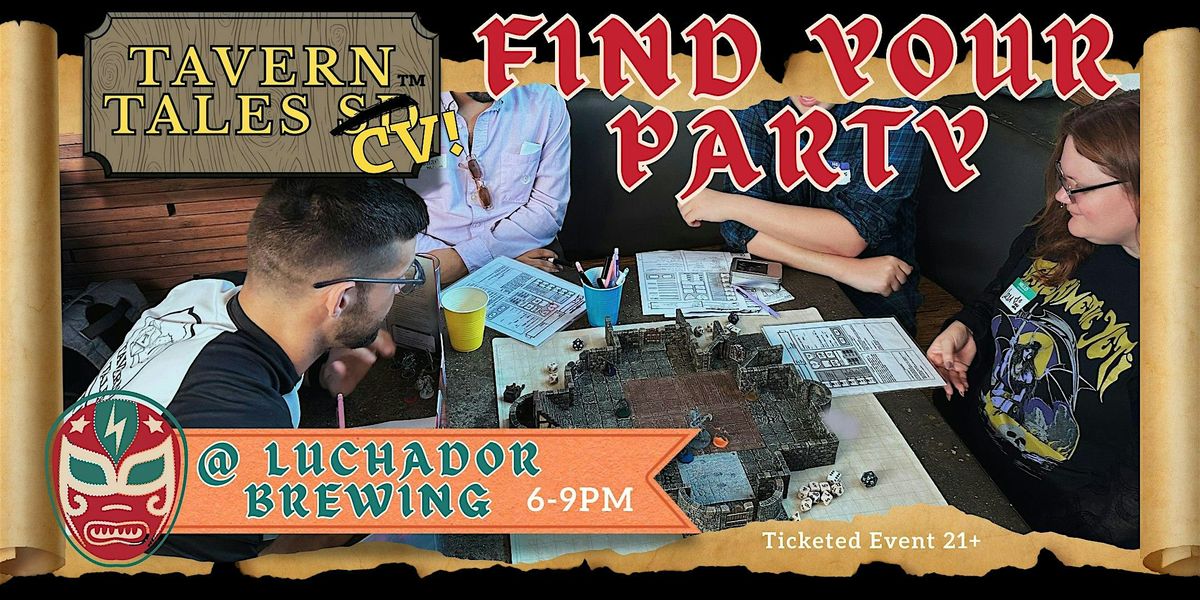 Come join us for a chance to build or expand your nerdy group of friends and participate in rapid-fire Dungeons and Dragons at Luchado Brewing! Designed to connect members of the Table Top community in a fun and inclusive space, Find Your Party will be a low stakes, high fun evening of dice rolling and questing antics. Whether you're a seasoned dungeon delver or have just been a little D&D curious, there's a place for everyone in our tavern. All gaming materials will be provided, so grab your ticket, bring your friends and let's make some positive memories and lasting friendships.