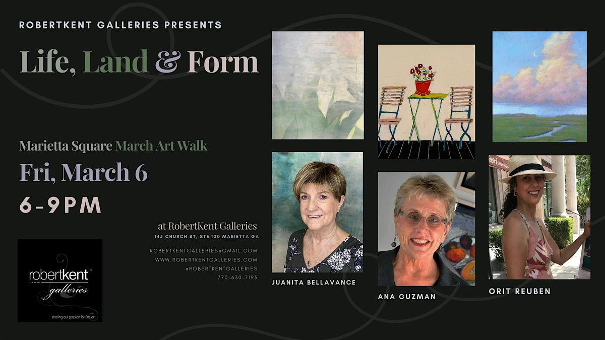 Join us for March ArtWalk at RobertKent Galleries & Frame Shop in the heart of Marietta Square as we open Life, Land & Form, a new exhibition featuring Juanita Bellavance, Ana Guzman, and Orit Reuben.