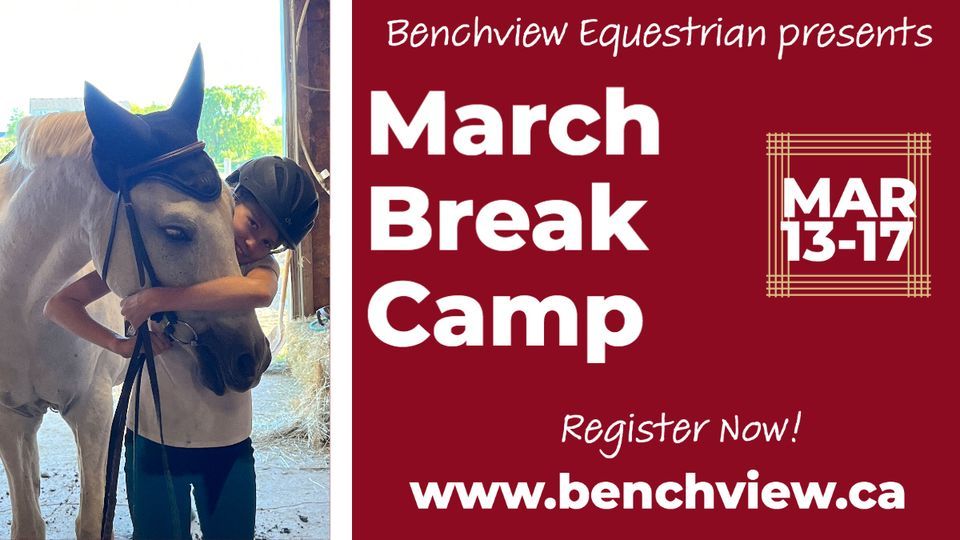 Benchview is excited to offer March Break Camp! A day camp for children ages 6 and older. Benchview's camps focus on learning the basics of horsemanship and developing a strong foundation in the art of horseback riding. Whether riders are brand new to riding or they are working on developing their canter and starting small jumps, Benchview's school horses are ready for a fun week of camp! Learning activities, daily riding lesson, arts and crafts, games, and more. Parents welcome Friday afternoon for our Showcase, where riders can show off to their parents all they have learned in the week. Camp runs Monday to Friday, 9am-4pm. Limited spots available. Register at www.benchview.ca/camps