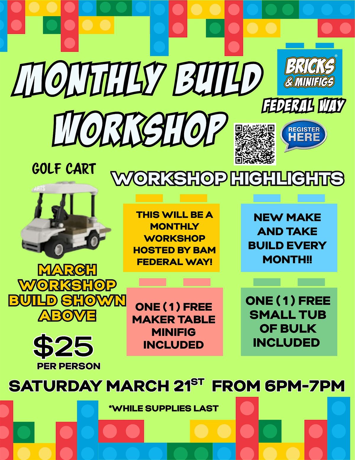 This is a monthly make and take workshop held at BAM Federal Way. The Monthly build for February is a Grand Piano! Each ticket includes the monthly built kit and instructions. We will build this together in our party room! To keep the building going at home, everyone will also be able to take home a small tub of bulk, as well as a minifig from our minifig make table! Come down, hang out with other builders, get to know our LEGO community and have a great time building with us!