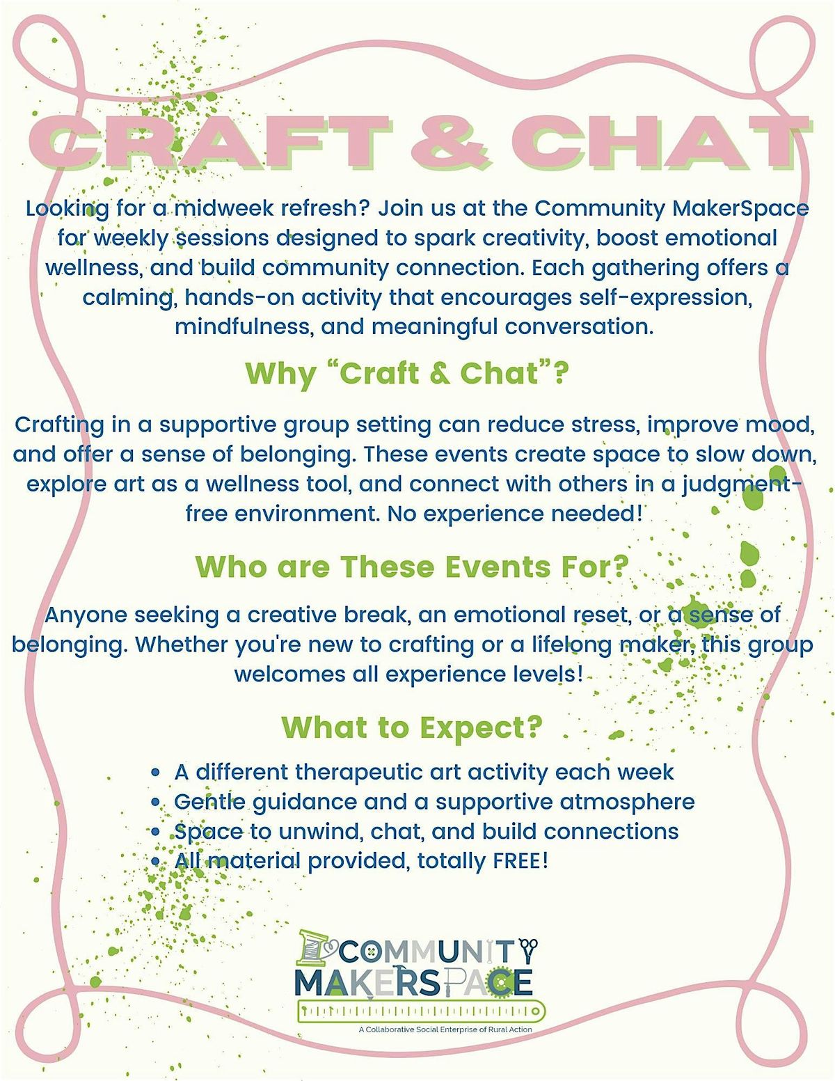Looking for a midweek refresh? Join us for FREE, hands- on craft nights designed to spark creativity, boost wellness, and connect with community. Each week, we'll explore wellness- inspired art activities enjoying conversation in a relaxed space. No experience needed!