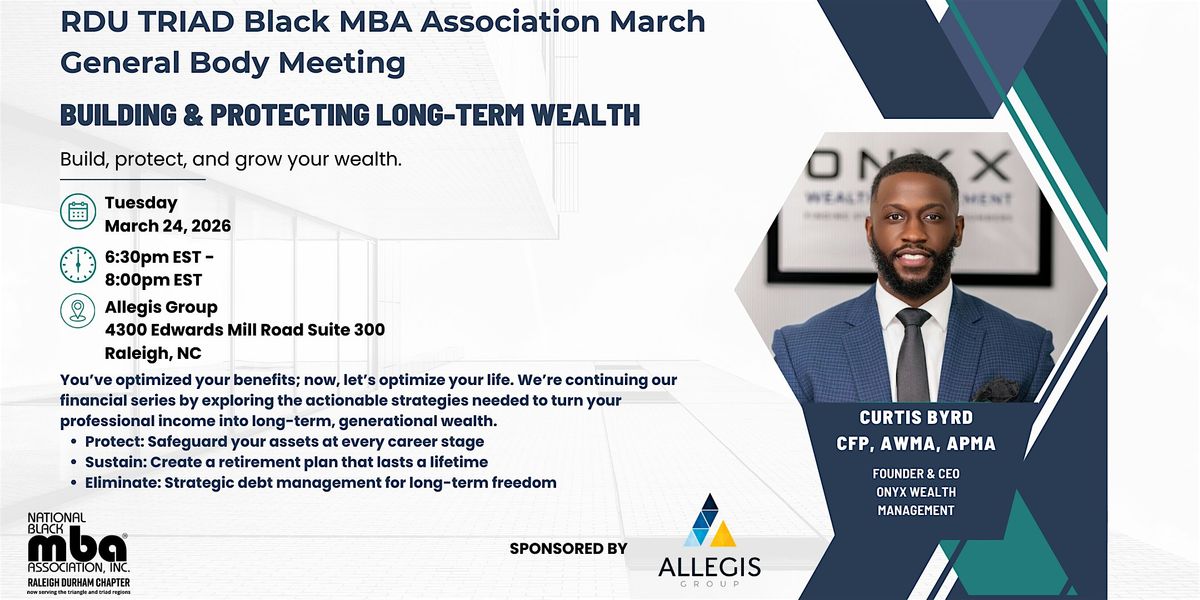Join the RDU Triad Chapter of the National Black MBA Association for our March General Body Meeting. Following our successful session on workplace benefits, we are taking the next step in our financial health, mastering the core principles of long-term wealth, protection, and debt elimination.