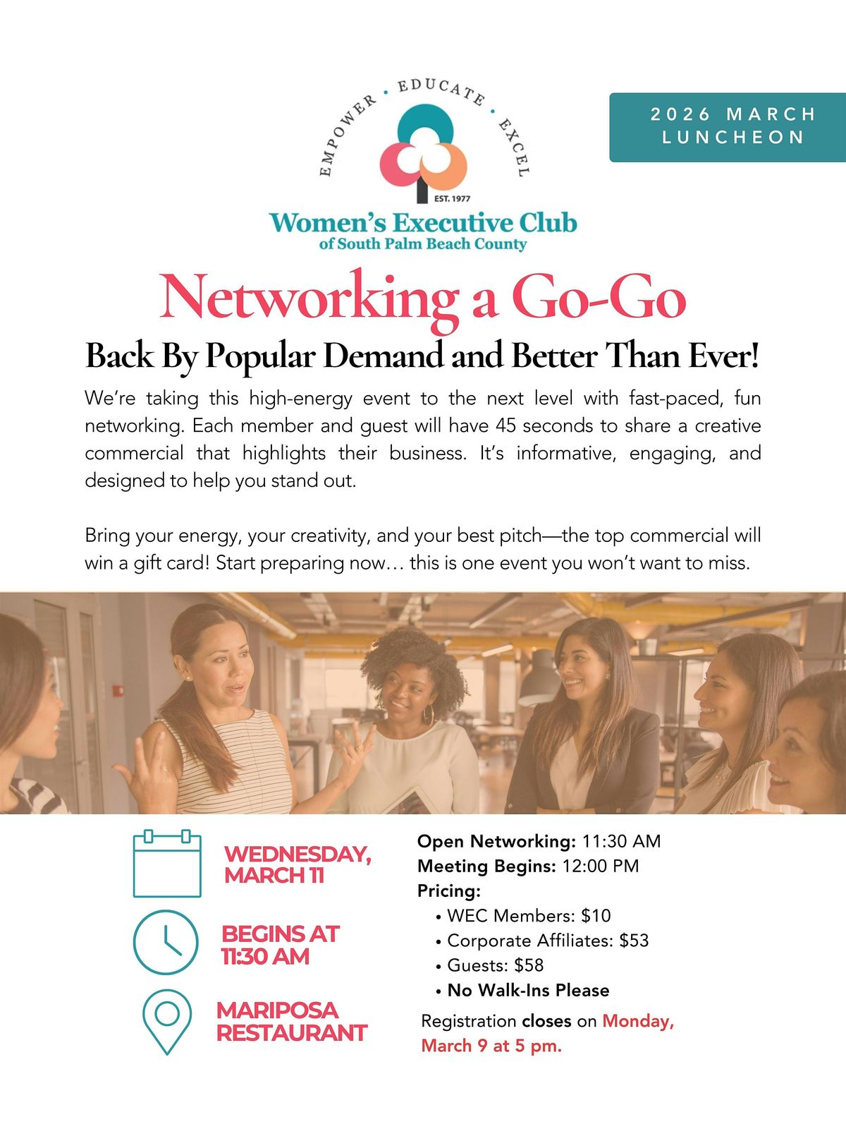 Jointhe Ladies of WEC at our new venue Mariposa's - 2nd floor of Neiman Marcus at Boca Town Center Mall. Enter throught the parking entrance. Turn right and take the elevator to the 2nd floor. Exit right and Mariposa is at the end of the hall.