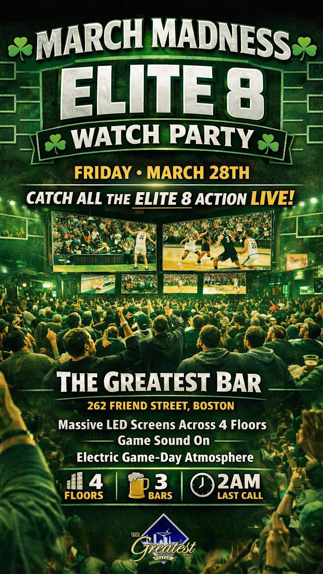 Championship dreams are on the line. Join us Saturday, March 28th at The Greatest Bar for the Elite 8 and catch every second live on massive LED screens across all four floors.
