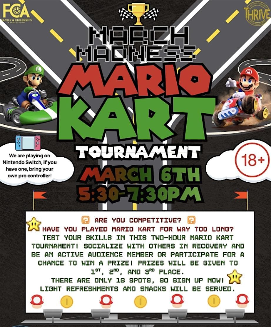 Are you competitive? Have you played Mario Kart for way too long? Test your skills in this two-hour tournament. Socialize with others in recovery and be an active audience member, or participate for a chance to win a prize. Prizes will be given to 1st, 2nd, and 3rd place.