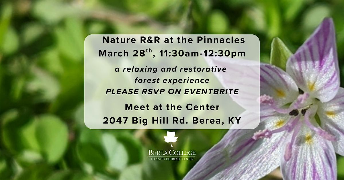 Come join us for a rejuvenating experience outdoors at the Pinnacles (2047 Big Hill Rd. Berea KY). Nature R&R is a slow-paced, relaxing and restorative forest experience. Please bring water and a portable seat or ground cover.