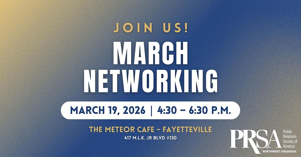 It’s networking time! Meet us at The Meteor Cafe in Fayetteville for our March NWA PRSA gathering. Grab a drink, make new connections and catch up with fellow communications professionals. Bring a colleague and come ready to mingle!
