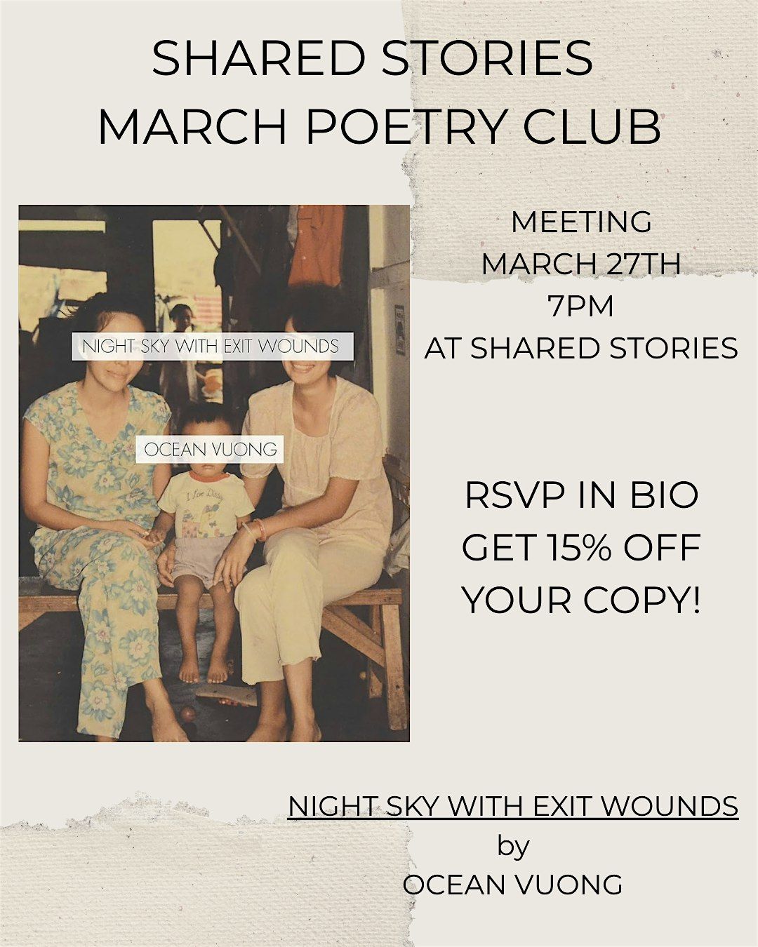 We are reading Night Sky with Exit Wounds by Ocean Vuong! Meeting March 27th at 7PM!About this Event