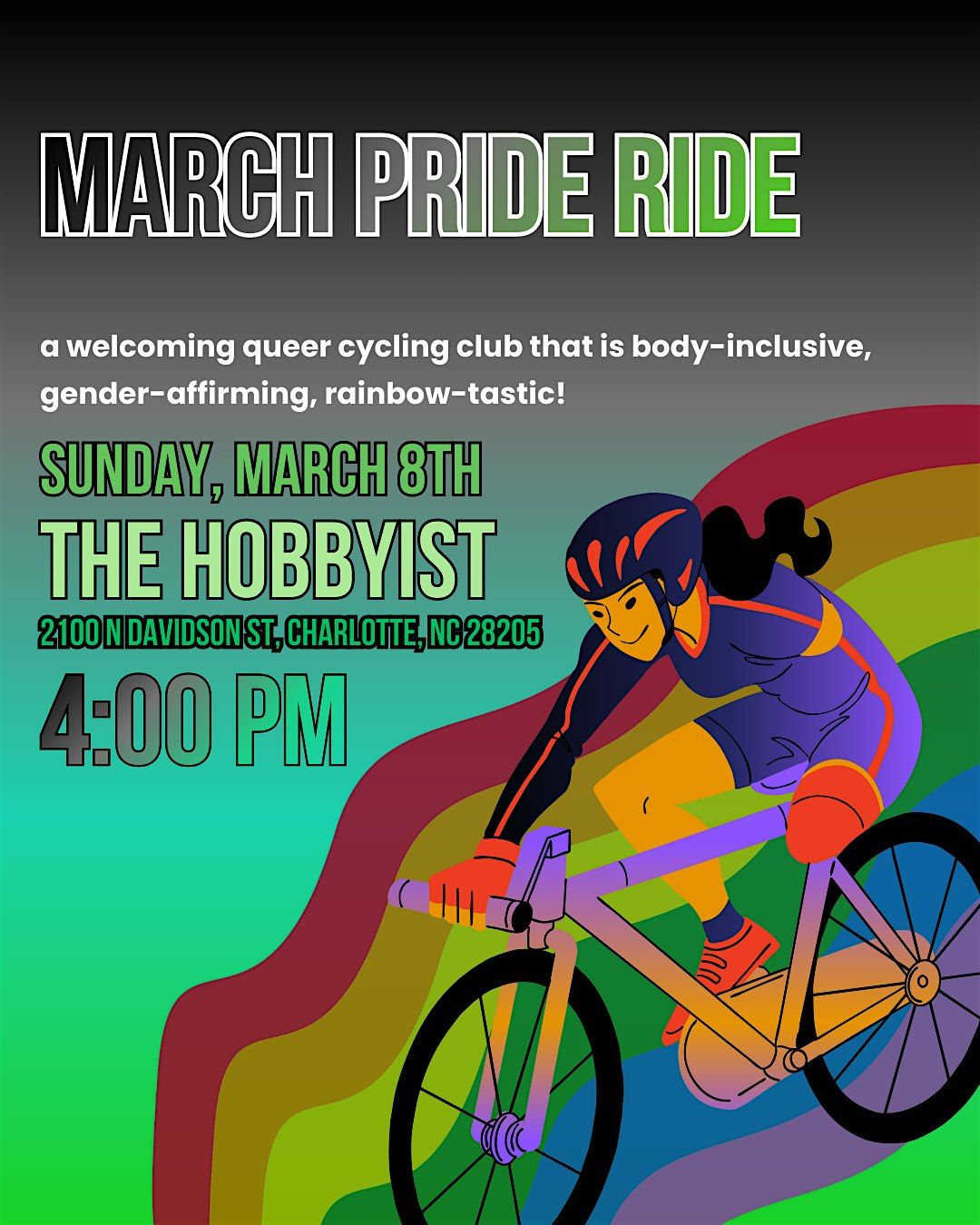 Charlotte Pride doesn’t stop in August—we keep the joy rolling into the whole year! Come ride with us along the Little Sugar Creek Greenway for an evening of queer community, movement, and plenty of laughs.