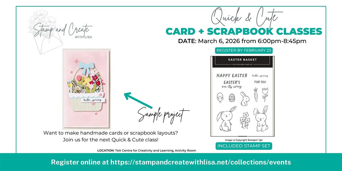 Want to make handmade greeting cards or scrapbook layouts? Come join me for the next Quick & Cute Classes at Tett Creativity Centre in Kingston on Friday, March 6, 2026, from 6:00-8:45pm. Class will be held in the Activity Room #108.
