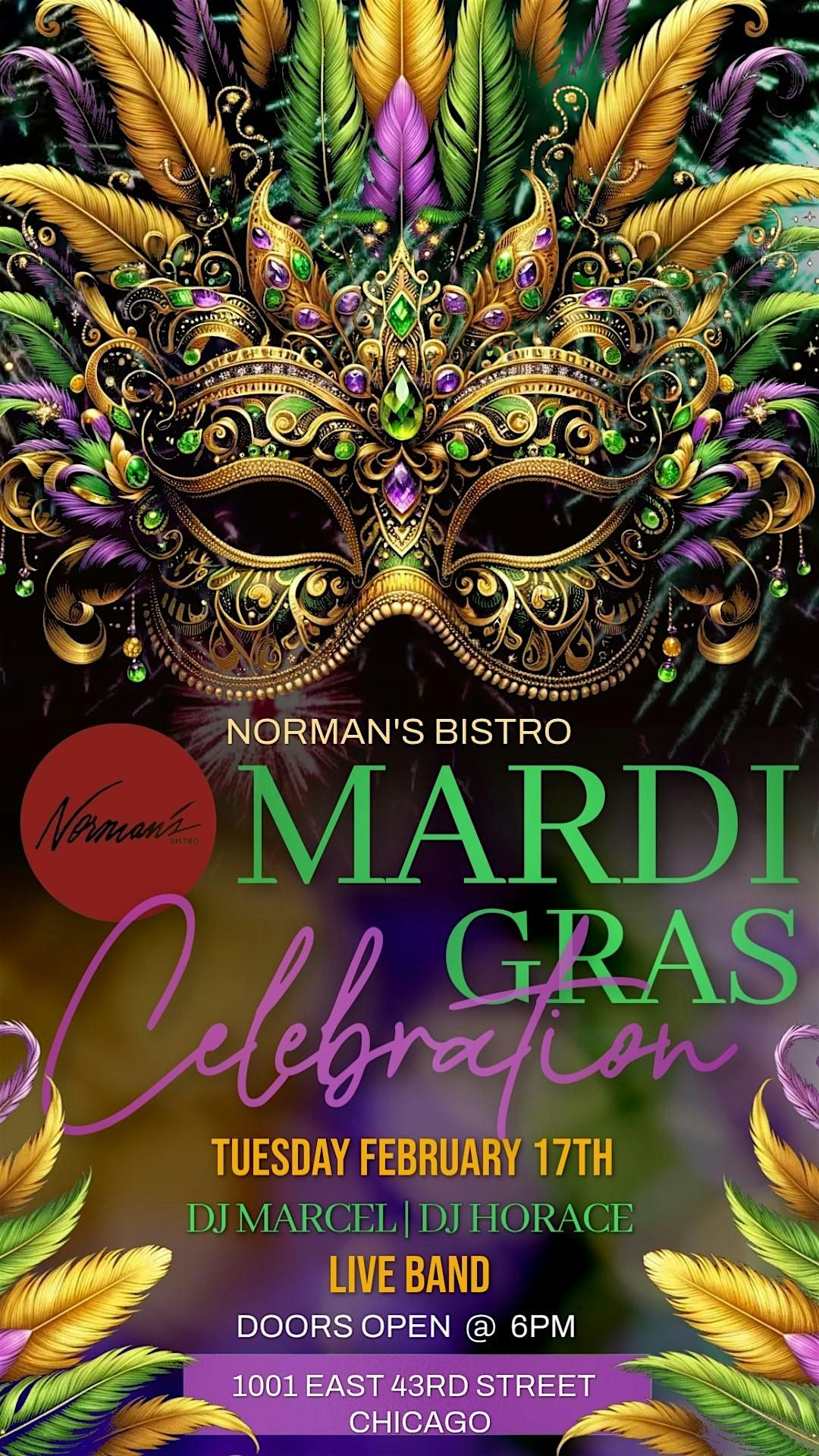Get ready to let the good times roll on Tuesday, March 4th for our annual Mardi Gras - Fat Tuesday bash! Experience the vibrant colors and lively spirit of New Orleans right here at Norman’s Bistro.