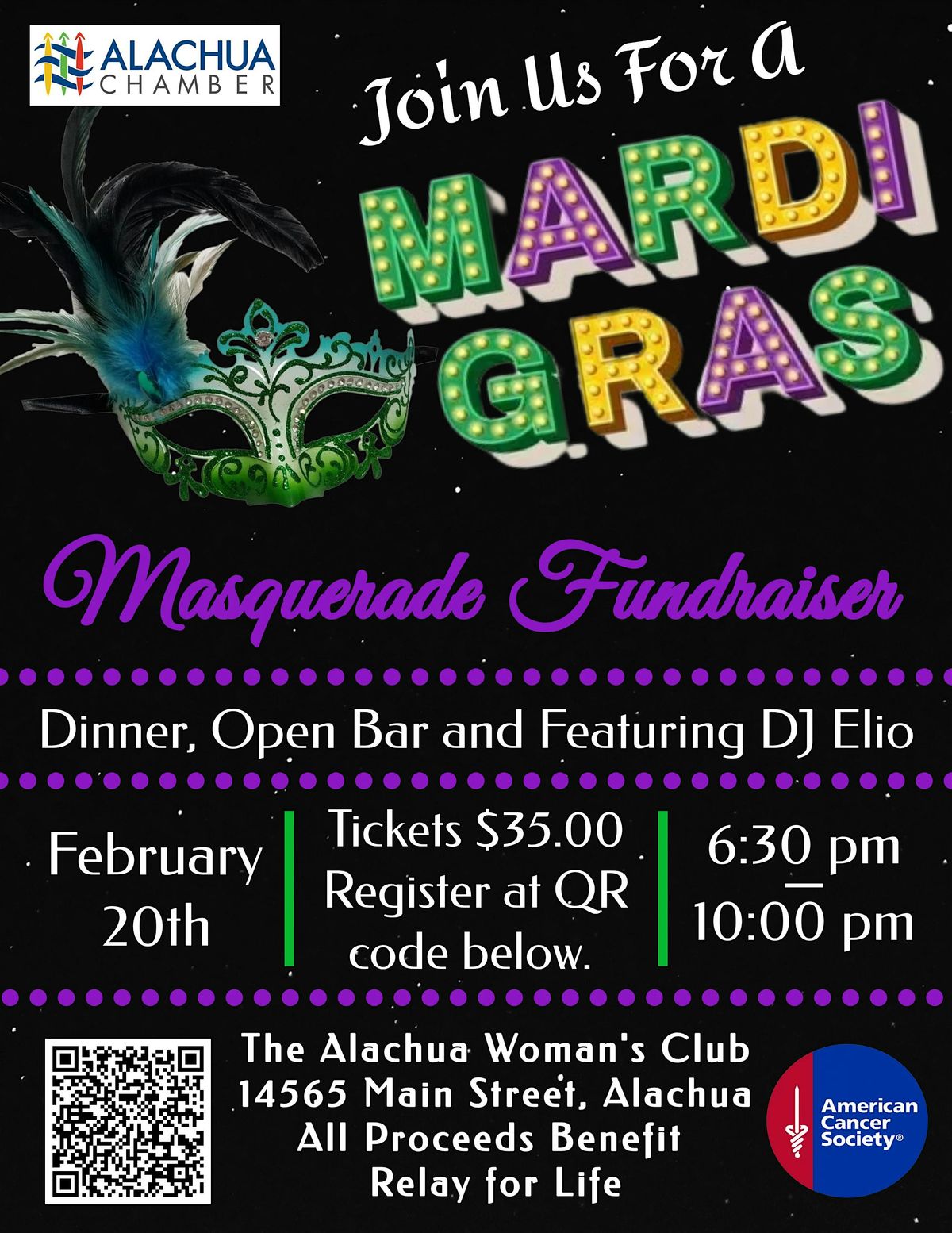 Attire is Mardi Gras style of any kind—formal, festive, or fun—but masks are required. Bring your group of friends and make it a night out to remember, all while supporting Relay for Life and a great cause.