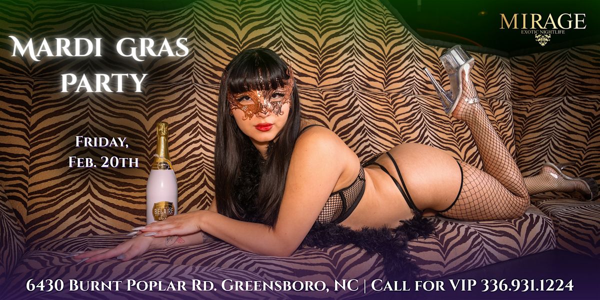Get ready for a night of mystery, excitement, and indulgence at Mirage Exotic Nightlife's Mardi Gras Masquerade Party! ðŸŽðŸ’œðŸ’šðŸ’›