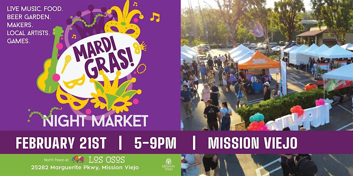 Let the good times roll! 🎉 Join us for a Mardi Gras–themed Night Market filled with live music, incredible food, local makers, and festive energy, all under the lights in Mission Viejo.