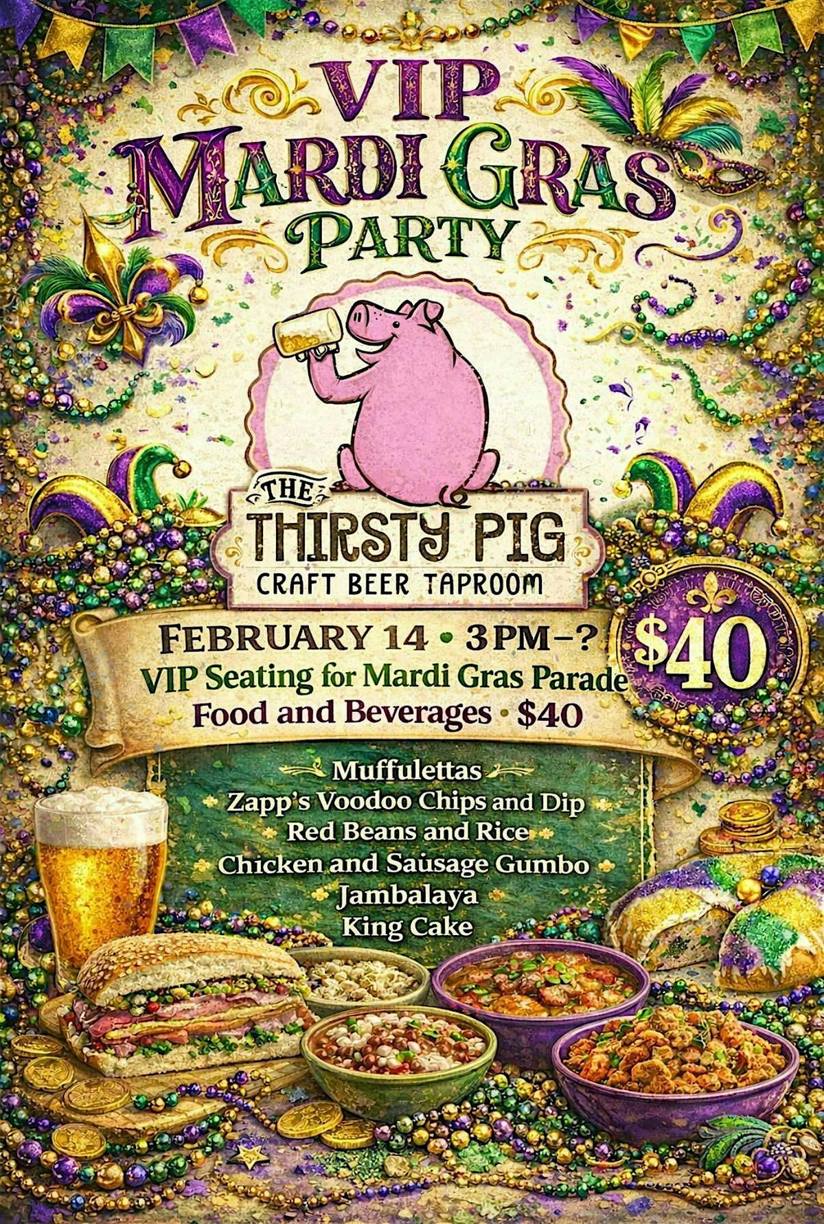 Get ready to experience the Mardi Gras Parade like never before! Join us in person for an unforgettable day packed with food, drinks, premium seating, and all the festive fun. With the VIP package, you'll enjoy exclusive access to the reserved bleacher seating, special cajun food treats, four beverages per person and a front-row view of all the action. Don your beads, bring your energy, and let's make this Mardi Gras one for the books!