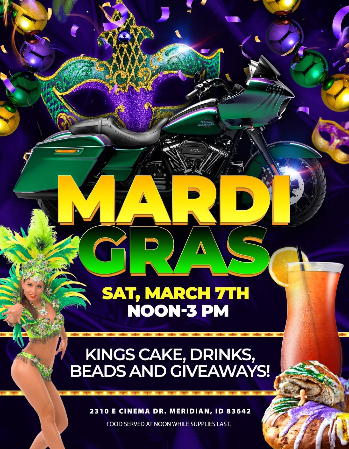 Join us on Saturday, March 7th, at High Desert Harley-Davidson for an unforgettable Mardi Gras celebration! We have everything you need for a fantastic time, including free King's Cake, delicious food and drinks, and giveaways. The Harley Girls will be there, adding to the excitement, along with plenty of beads and masks to get you into the Mardi Gras spirit. Bring your friends and family for a day full of excitement and celebration. We can't wait to see you there!