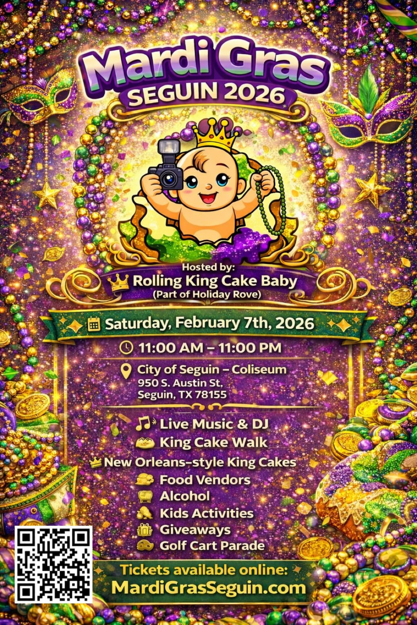 Mardi Gras Seguin 2026 is coming to the Seguin Coliseum on February 7th, and you do not want to miss out on all the excitement! Get ready to snap photos with our Rolling King Cake Baby, participate in our Holiday Rove float contest for a chance to win a cash prize, and enjoy a King Cake Walk every hour on the hour. Indulge in delicious king cakes, daiquiris, and mouth-watering treats from our multiple food and merchandise vendors.