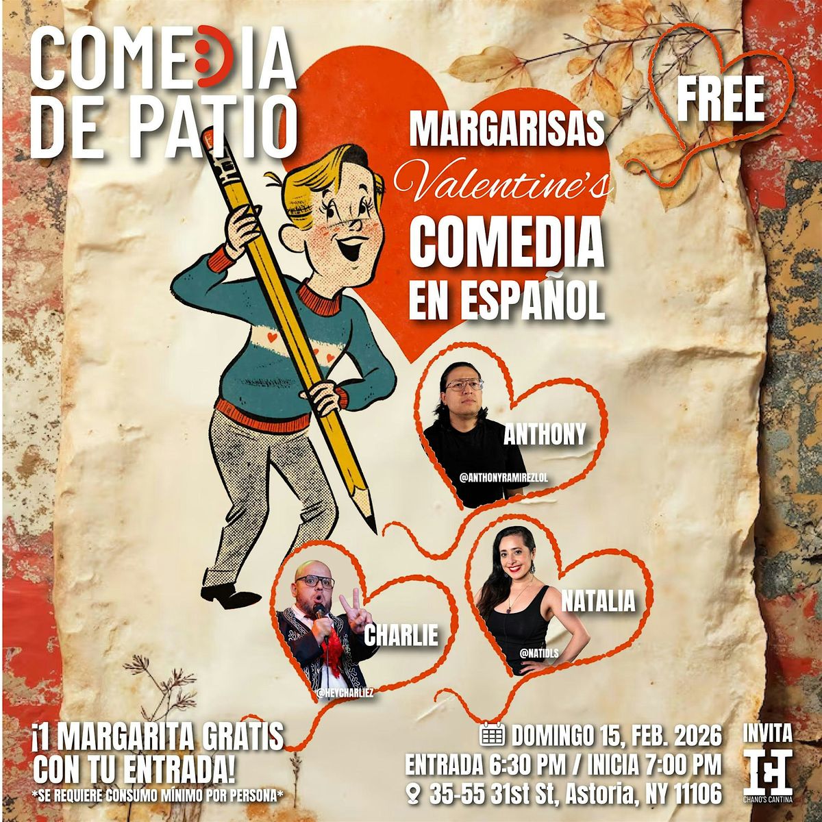 La entrada es completamente GRATIS, lo que lo convierte en el plan perfecto para disfrutar comedia en español en vivo con talentos como Anthony Ramírez, Charlie Z y Natalia de los Santos en el gran ambiente de Chano’s Cantina, Astoria.