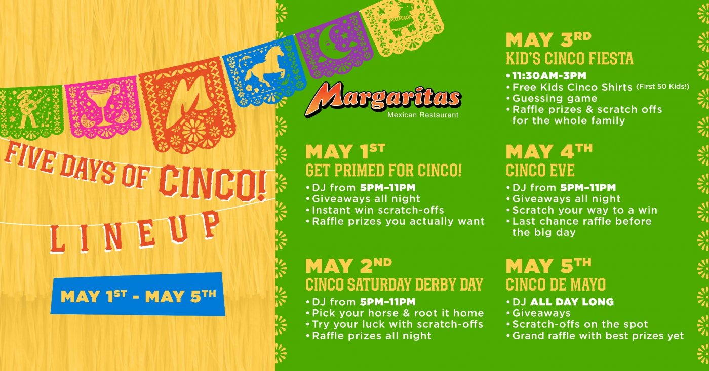 Margaritas Mexican Restaurant is once again celebrating Cinco de Mayo with its 5 Days of Cinco Fiesta!