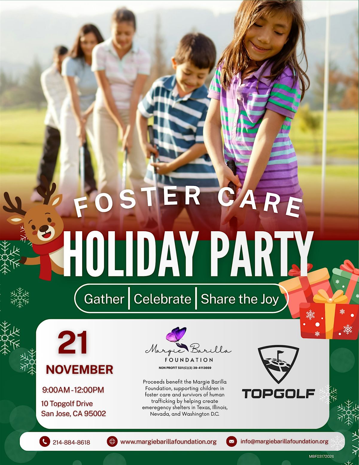 The Foster Care Holiday Party is a community-centered event taking place on November 21 from 9:00 AM to 12:00 PM at Topgolf in San Jose, CA. Organized by the Margie Barilla Foundation, the event invites families, supporters, and community members to gather, celebrate, and share the joy of the holiday season while making a meaningful impact.