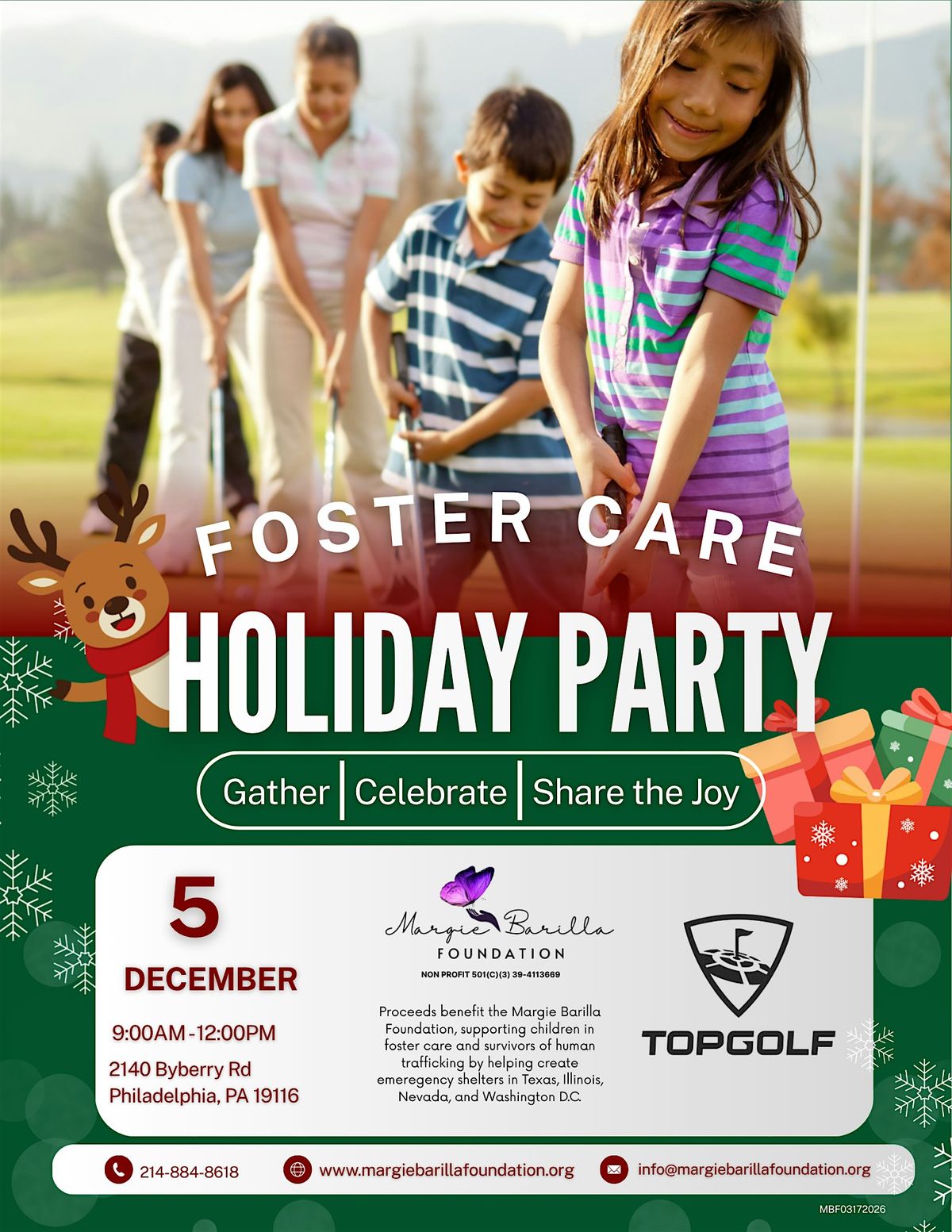 The Foster Care Holiday Party is a community-centered event taking place on December 5 from 9:00 AM to 12:00 PM at Topgolf in Philadelphia, PA. Organized by the Margie Barilla Foundation, the event invites families, supporters, and community members to gather, celebrate, and share the joy of the holiday season while making a meaningful impact.