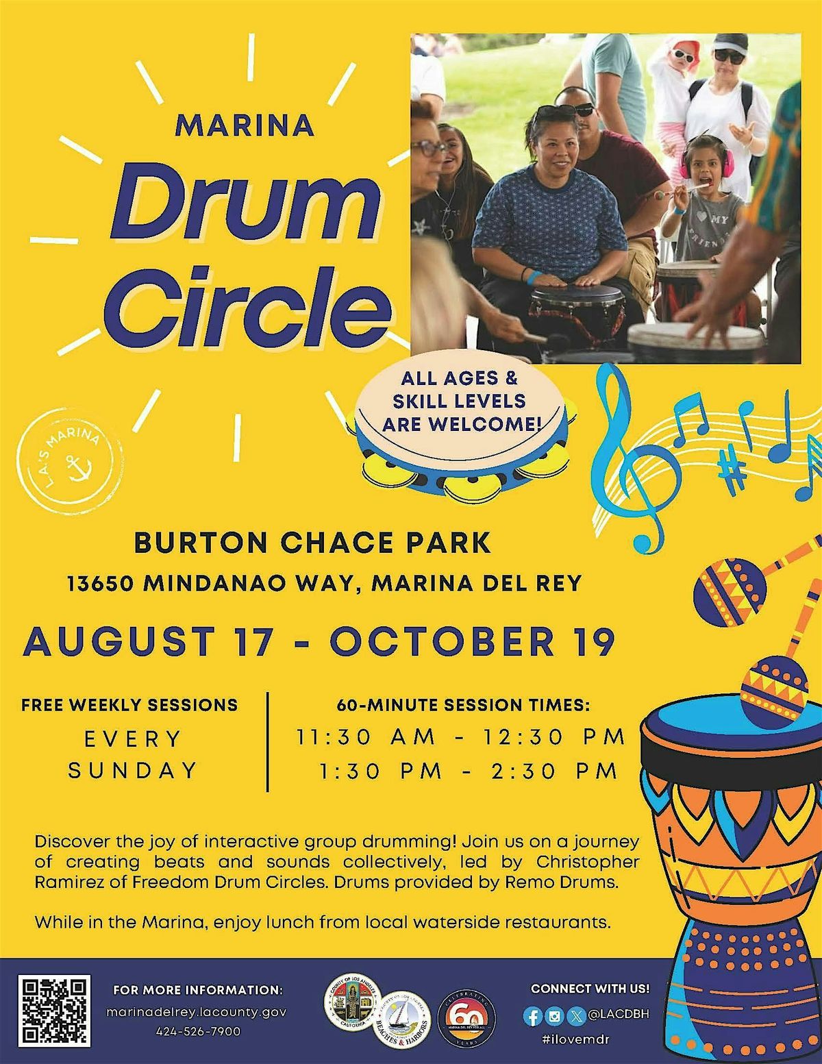 Come and join in on the Marina Drum Circle led by Christopher Ramirez of Freedom Drum Circles. Drums provided by Remo Drums.