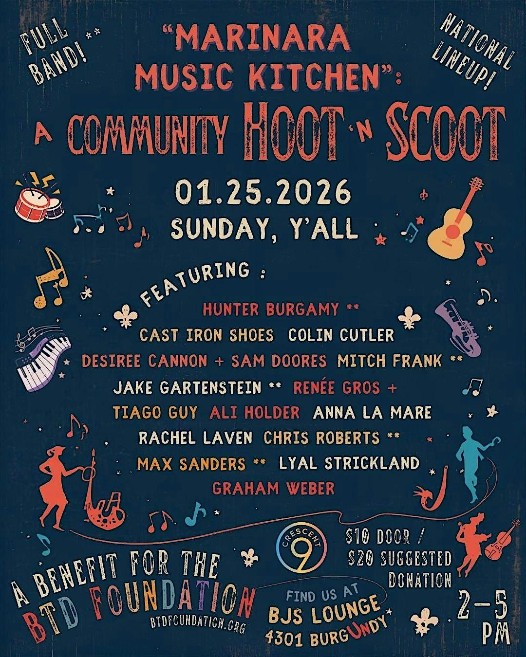 Marinara Music Kitchen: A Community Hoot ’n Scoot is a Sunday afternoon benefit concert bringing together songwriters from around around the U.S. for a joyful, collaborative celebration of music rooted in Louisiana and beyond.