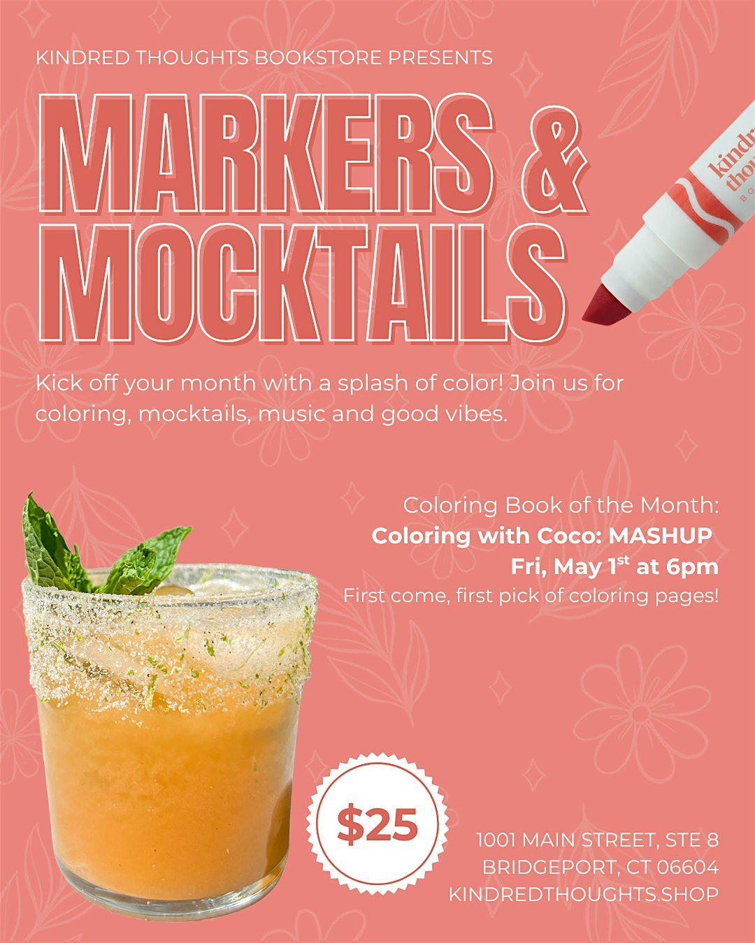 We'll have pages and coloring supplies, but feel free to bring your own favorite coloring utensils. First come, first pick of designs; markers, mocktails, music and chill vibes included.