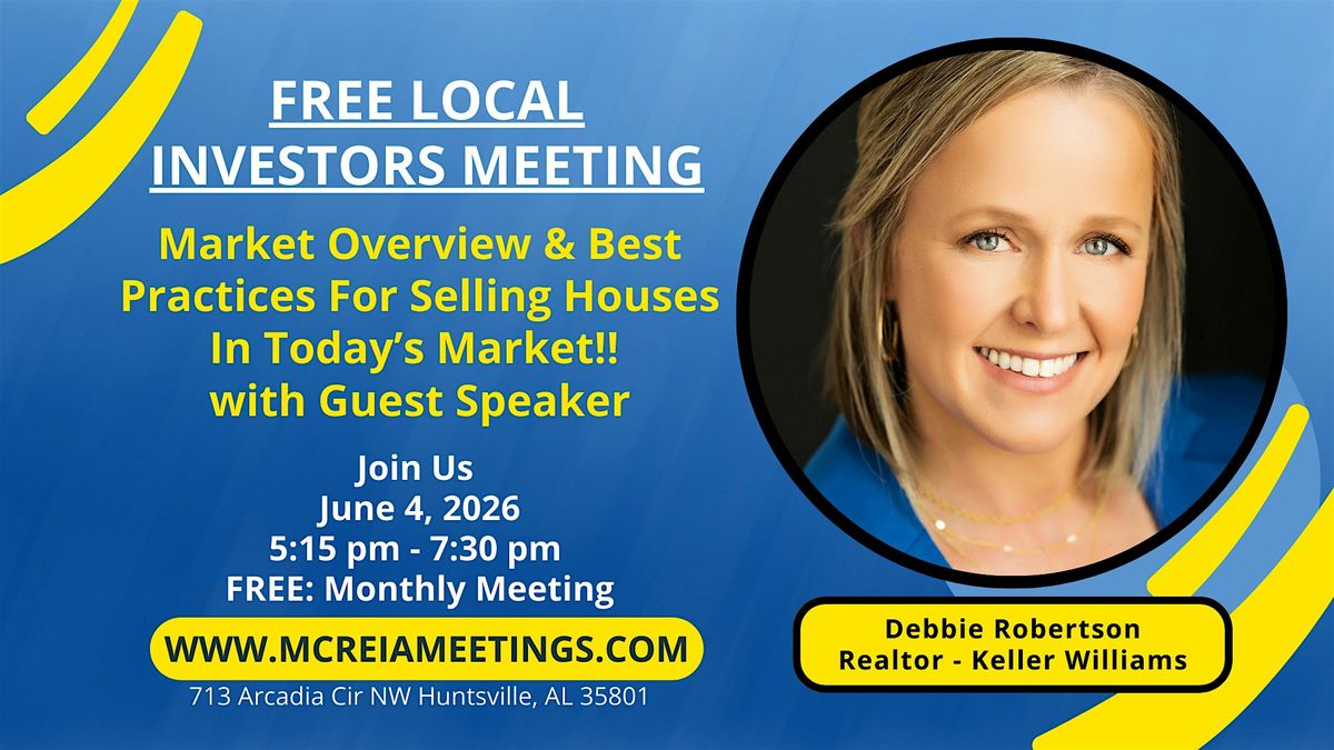 Come network and meet with new and seasoned real estate investors, flippers, realtors, landlords, wholesalers, hard & private money lenders, and bankers as we discuss, "Market Overview For Northern Alabama & How To Sell Your Houses Fast In Today's Market "