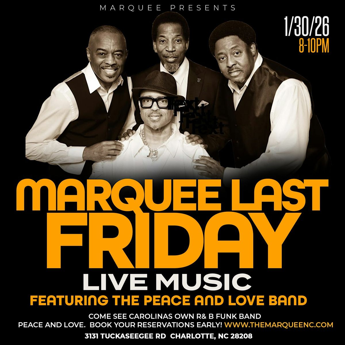 Kick off your weekend at Marquee Last Friday: Live Music featuring The Peace and Love Band, bringing Carolina-grown R&B and funk vibes to the stage.