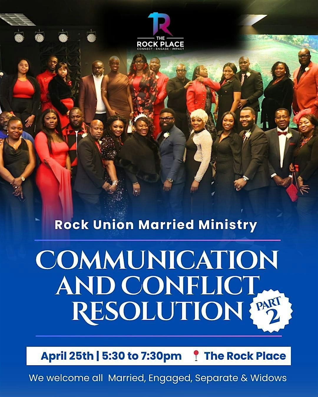 Ready to elevate your marriage and grow stronger together? 💍✨ Join us for **Communication & Conflict Resolution Part 2** on **April 25th, 2026 from 5:30–7:30 PM at The Rock Place**! This powerful session will equip you with practical tools to communicate better, resolve conflict with wisdom, and deepen your connection like never before.