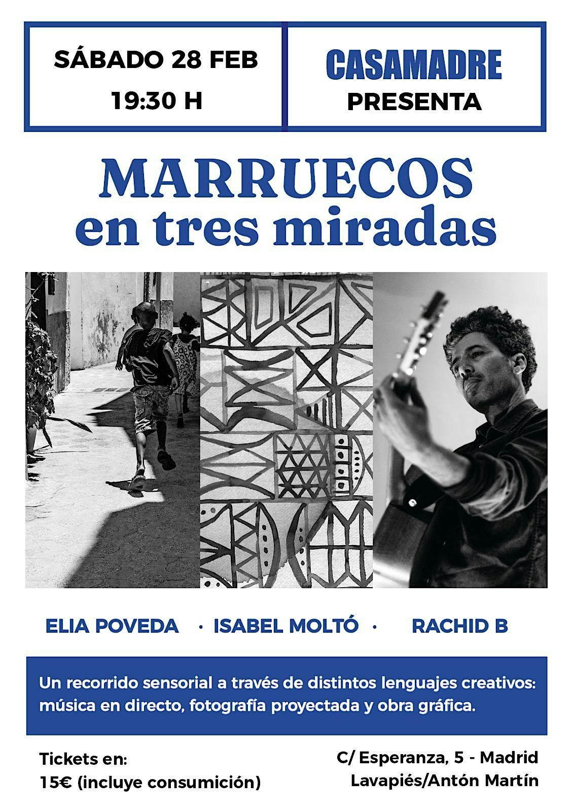 MARRUECOS en tres miradas te invita a vivir un recorrido sensorial a través de distintos lenguajes creativos en el corazón de Lavapiés. En CasaMadre (Calle Esperanza,5), el artista Rachid B ofrecerá un concierto en directo mientras se proyecta la obra fotográfica de Elia Poveda y se expone la obra física de Isabel Moltó. Música, imagen y materia se entrelazan para ofrecer una experiencia artística única inspirada en Marruecos.