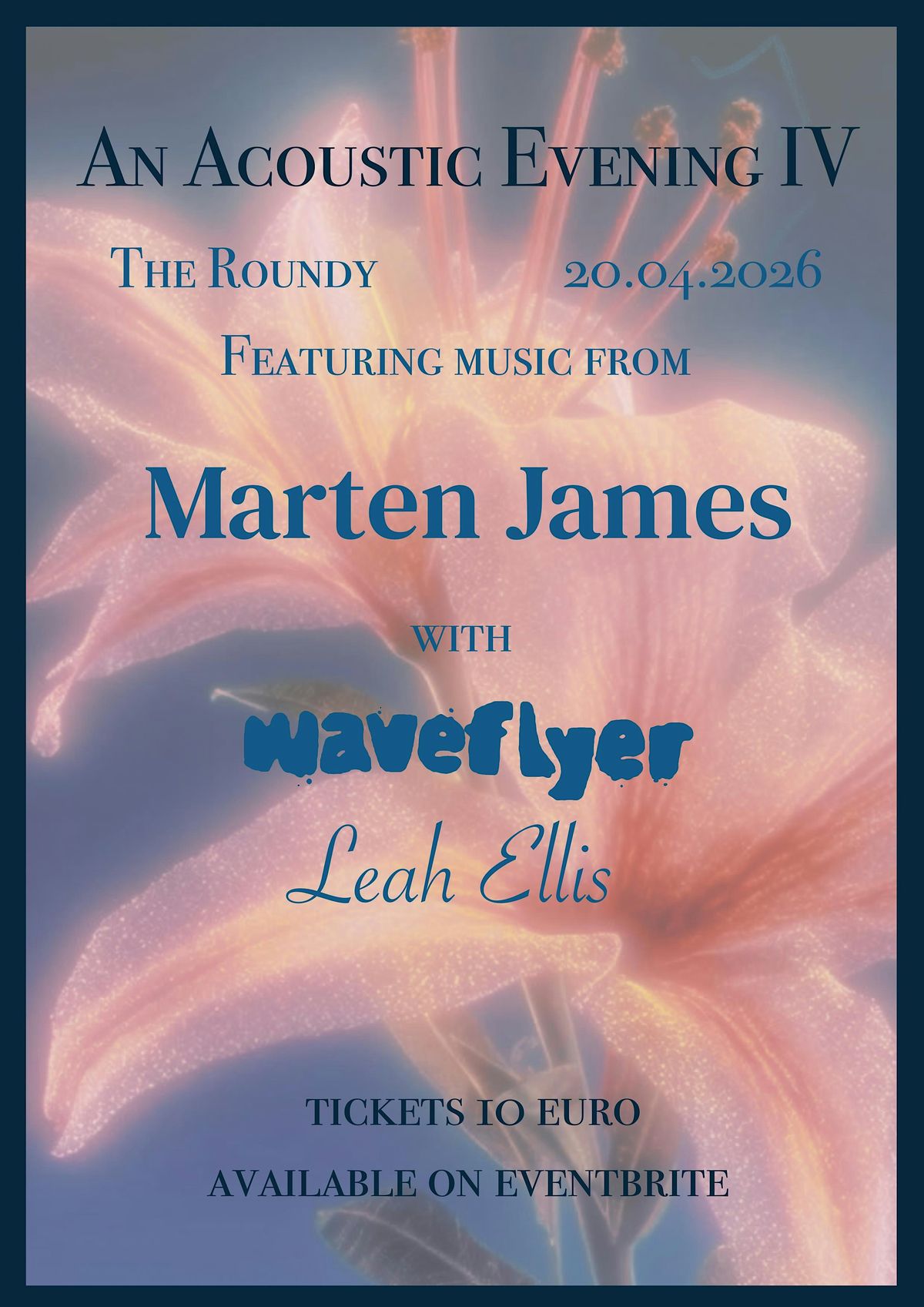 A night of transcendent music waits for you at The Roundy! Join Marten James and upcoming, soon-to-be-famous, brilliant talents Waveflyer and Leah Ellis for an acoustic, candlelit night of ethereal melodies, soulful harmonies and eclectic rhythms, all for just ten euros. It's not one to miss folks, see you there!