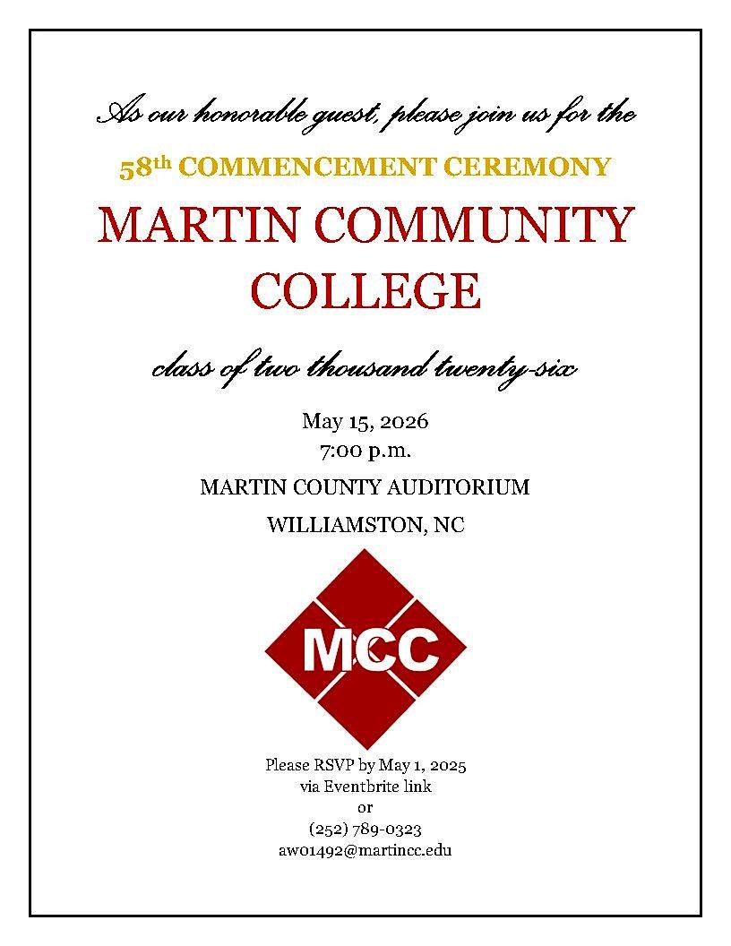 You are invited to attend Martin Community College’s 2026 Commencement Ceremony as a special guest. Reserved seating has been arranged for you in recognition of your support of the College and our graduates. Doors will open at 5:30 PM. Upon arrival, please check in at the Special Guests table for seating directions.