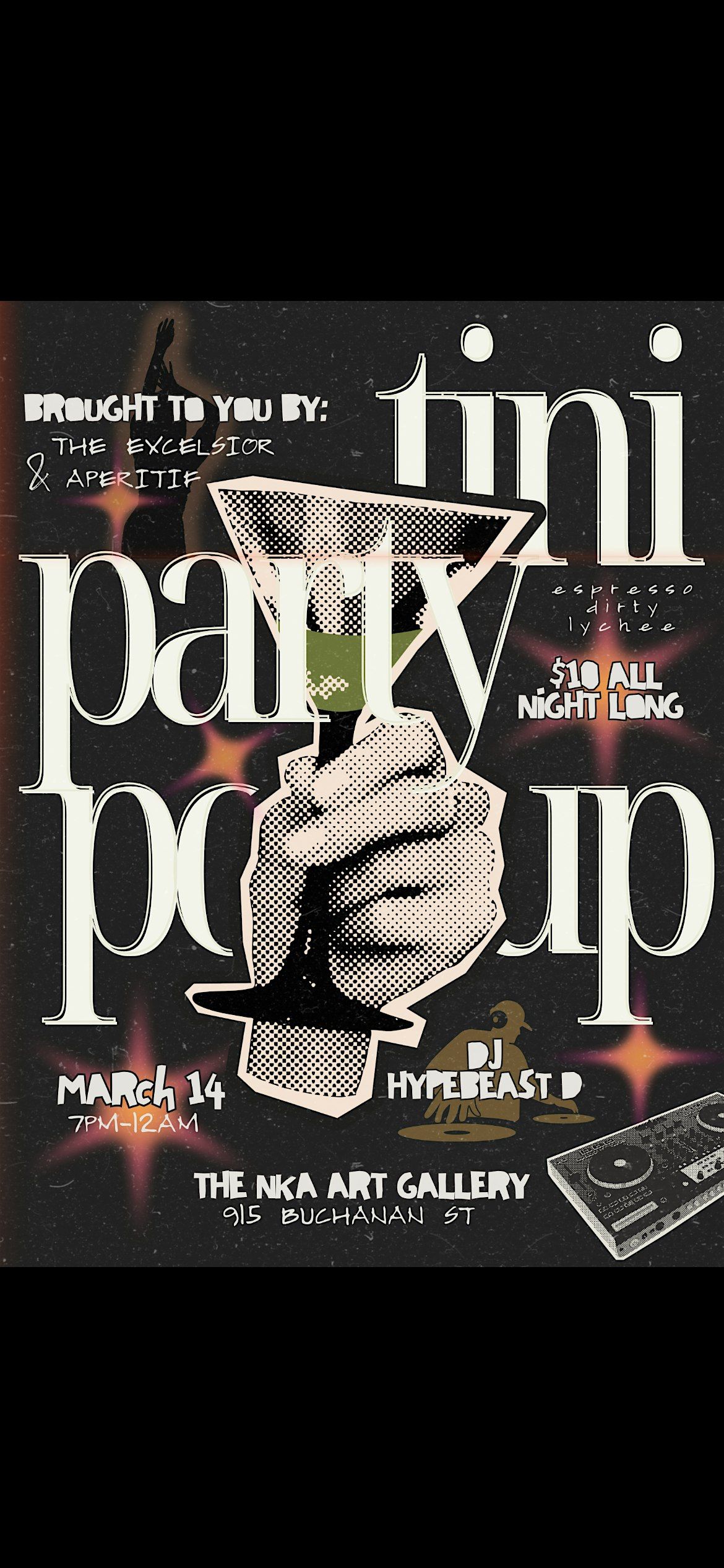 Get ready for a fun night at the Martini Party Pop Up! Join us on March 14, 2026 at 7:00 PM (Central Time) at 915 Buchanan St. Join us at The NKA Art Gallery for a live art display by Shabazz, sounds by DJ Hypebeast, and pizza slices + yummy snacks provided by Slim & Huskys.