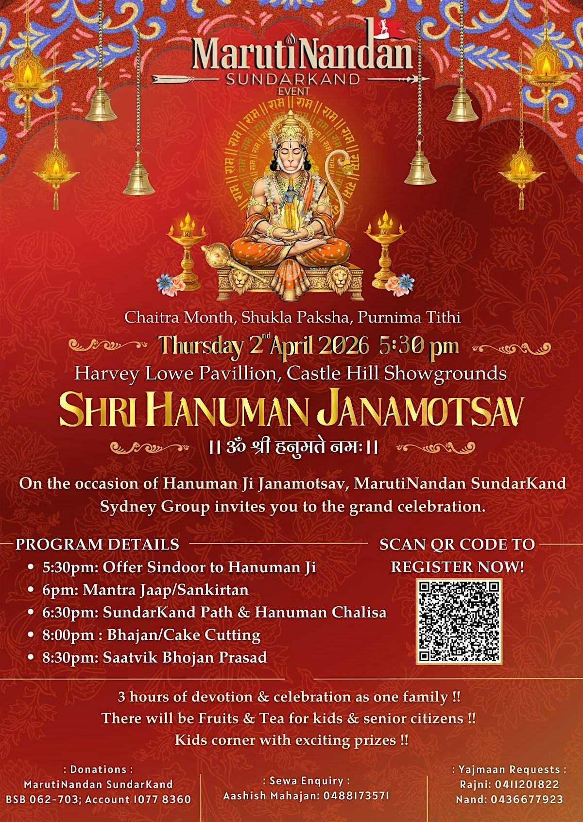 - Sindoor Offering. Offer sindoor to Hanuman ji. Details will be shared with registered participants.